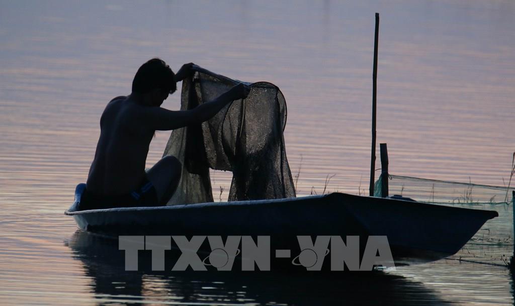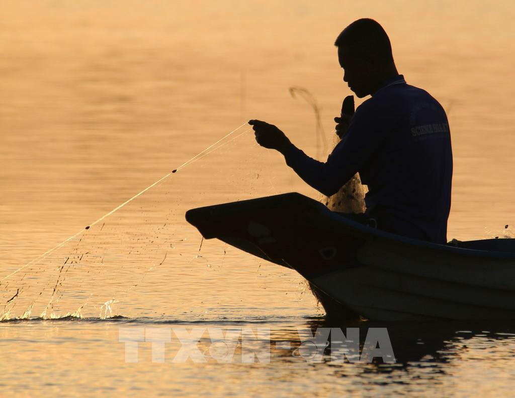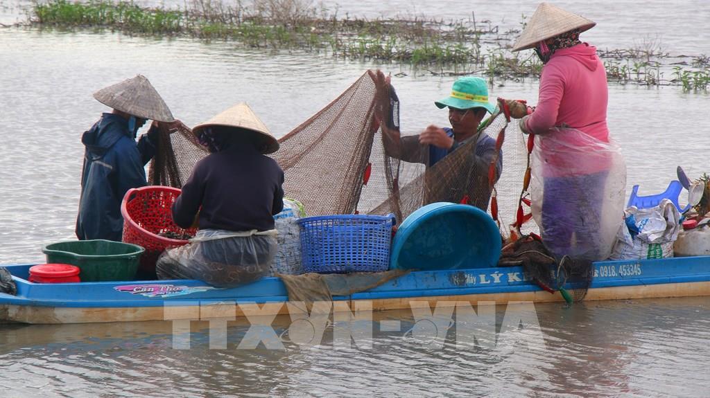 Giăng lưới bắt cá trên cánh đồng mùa lũ xã Vĩnh Viễn, thành phố Cần Thơ. Ảnh: Duy Khương - TTXVN