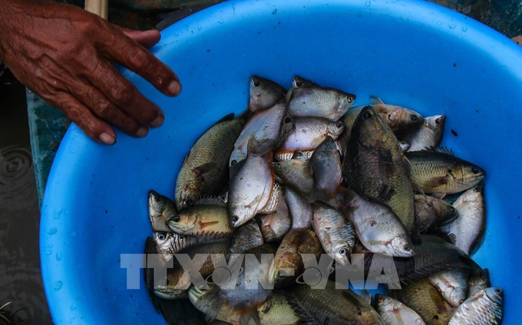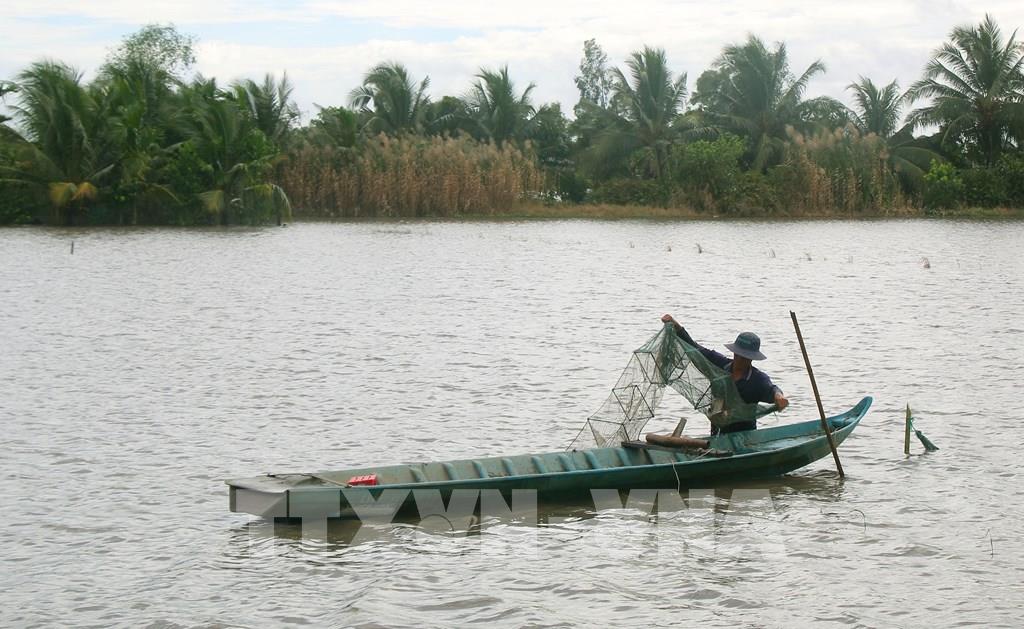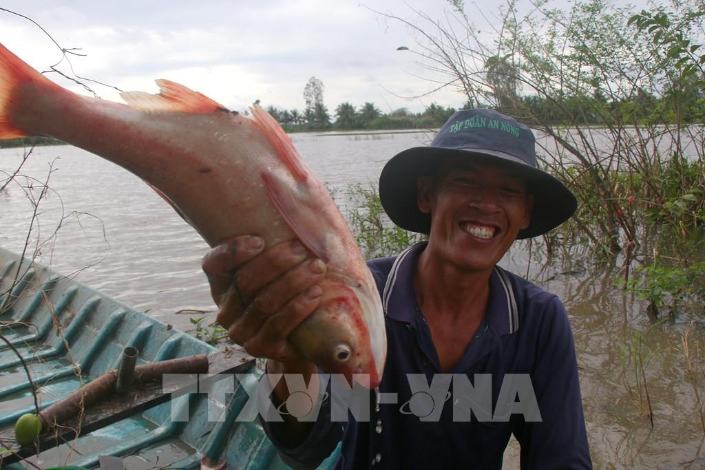 Người dân xã Lương Tâm thành phố Cần Thơ nuôi cá tôm trên ruộng lúa mùa lũ. Ảnh: Duy Khương - TTXVN