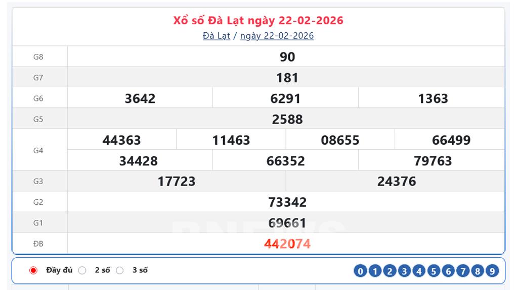 Kết quả xổ số Đà Lạt Chủ nhật ngày 22/2/2026