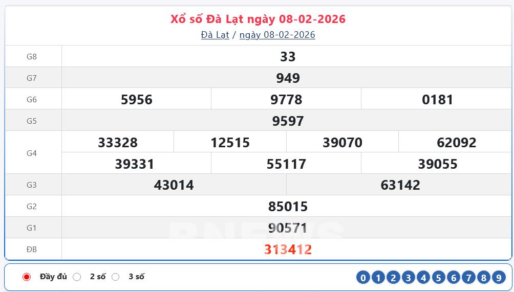 Bnews. XSĐL 8/2. XSDL 8/2. KQXSDL. Kết quả xổ số hôm nay ngày 8/2. XSĐL Chủ nhật. Trực tiếp KQXSĐL ngày 8/2. Kết quả xổ số Đà Lạt hôm nay ngày 8/2/2026.