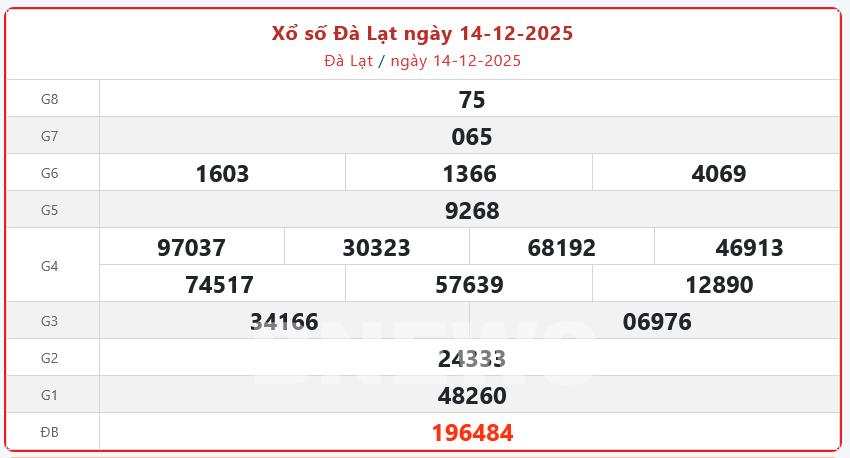 Kết quả xổ số Đà Lạt Chủ nhật ngày 14/12/2025