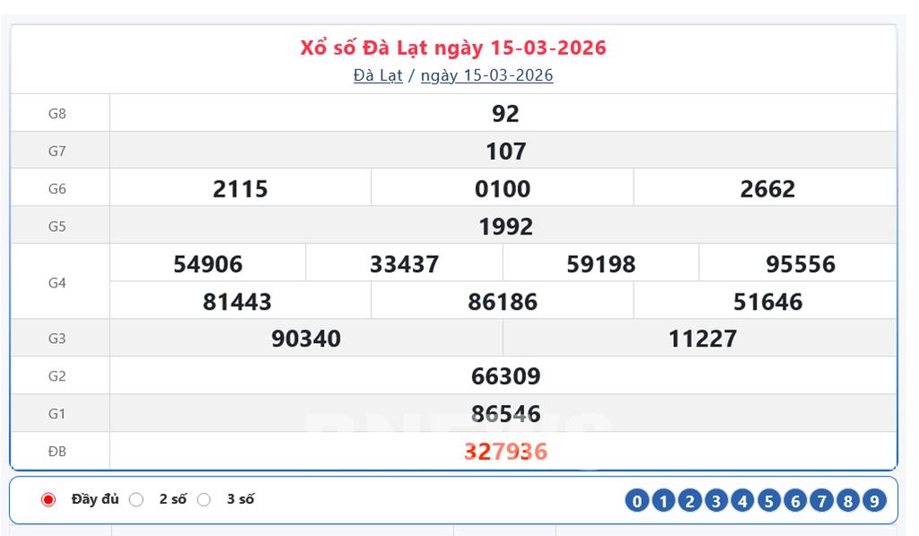 Trực tiếp XSĐL 15/3. Kết quả xổ số Đà Lạt hôm nay ngày 15/3/2026