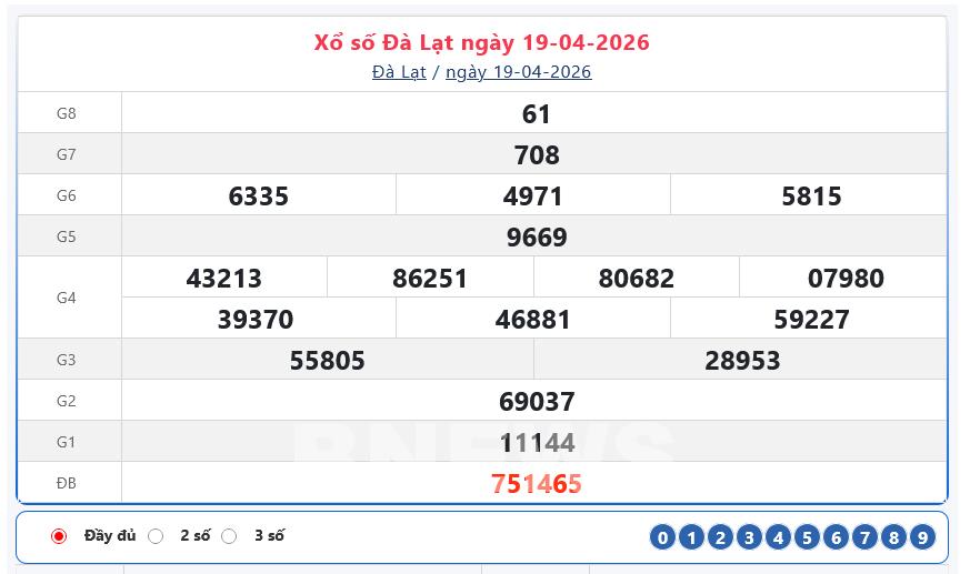 Kết quả xổ số Đà Lạt Chủ nhật ngày 19/4/2026