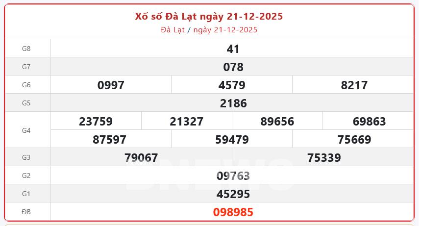 Kết quả xổ số Đà Lạt Chủ nhật ngày 21/12/2025