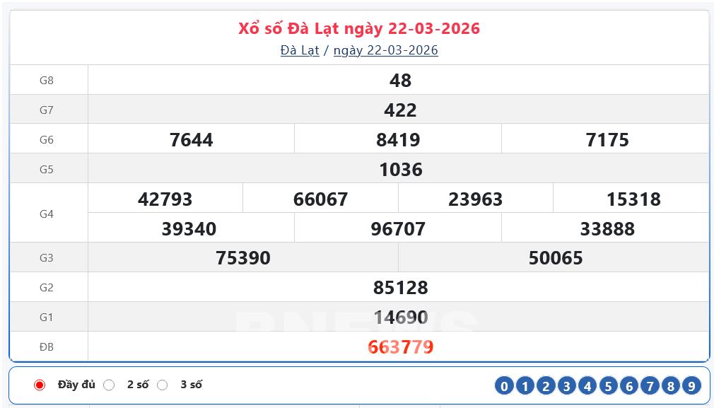 Kết quả xổ số Đà Lạt Chủ nhật ngày 22/3/2026