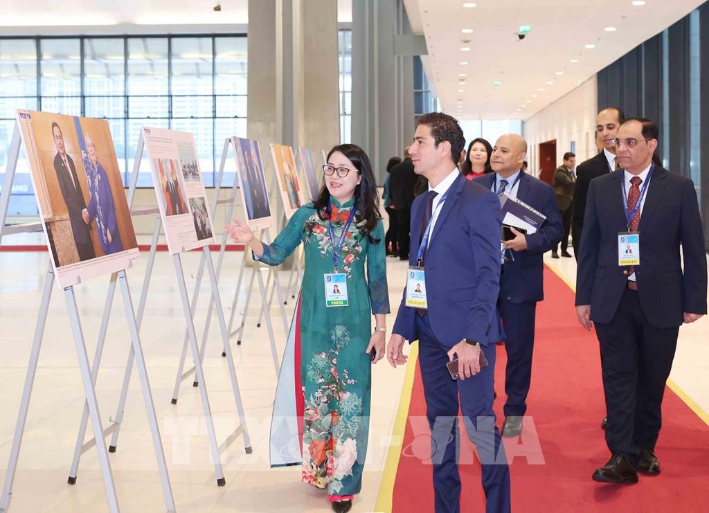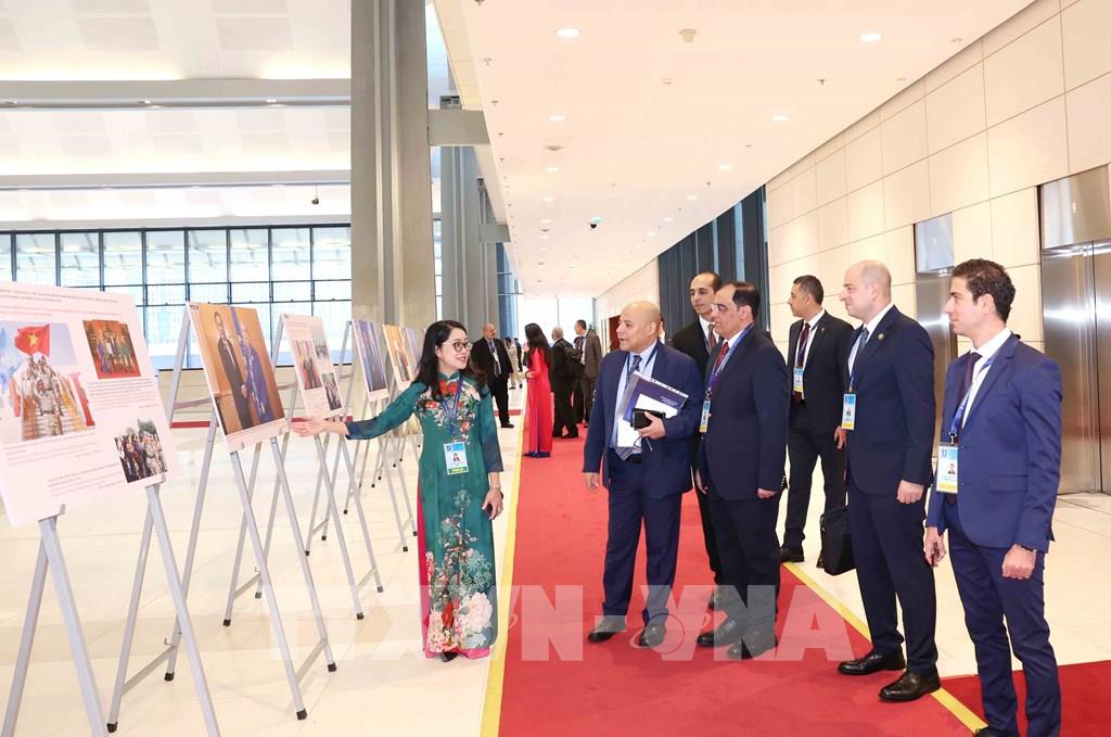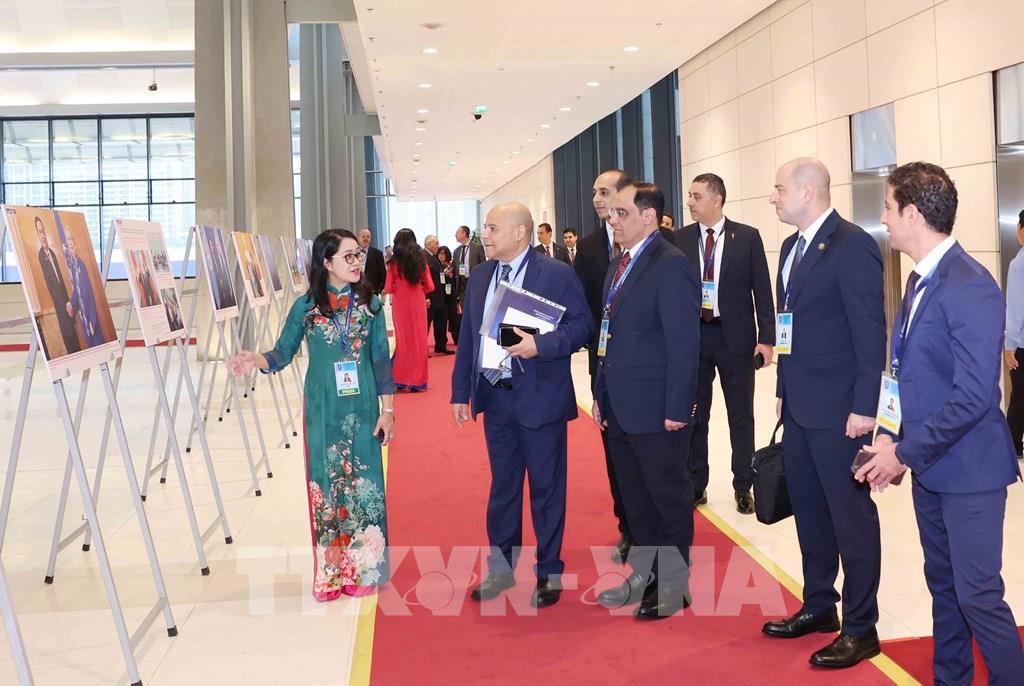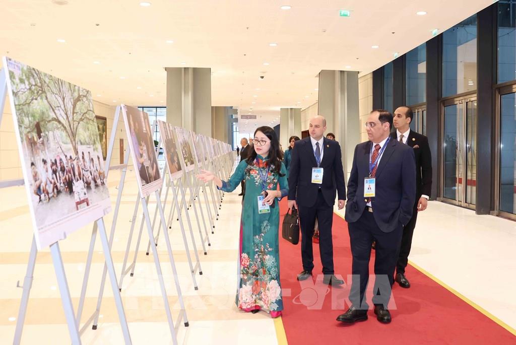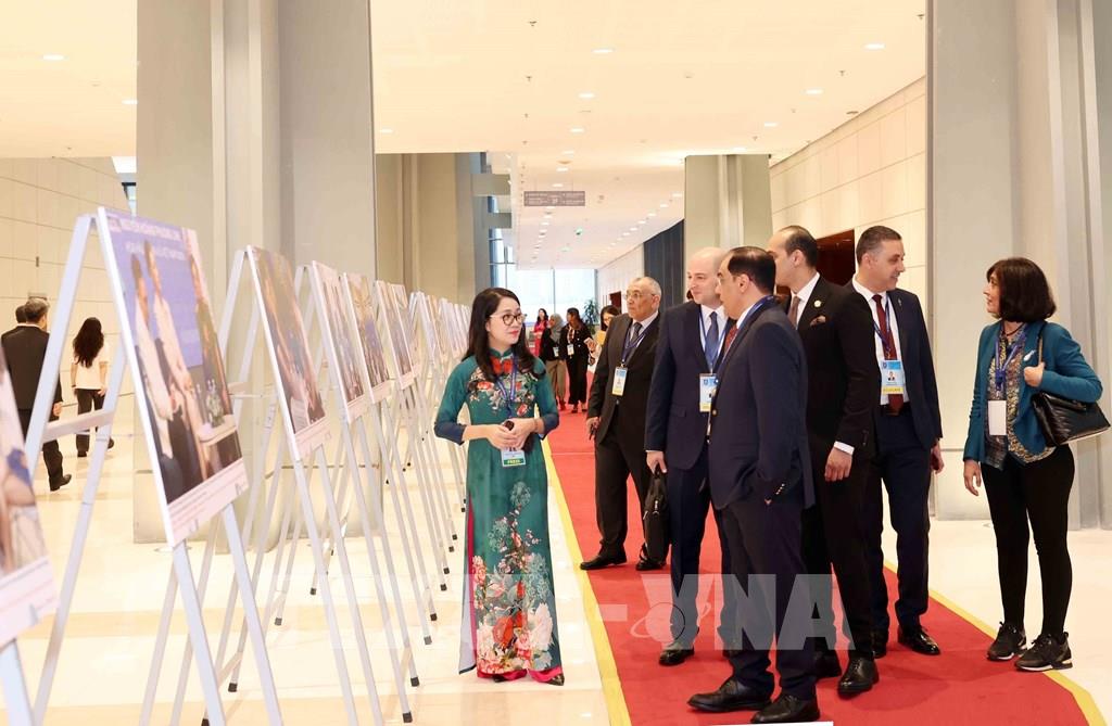 Đại biểu quốc tế tham quan trưng bày ảnh của Thông tấn xã Việt Nam tại Lễ mở ký Công ước Hà Nội, sáng 25/10. Ảnh: Phương Hoa - TTXVN