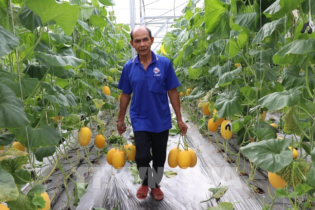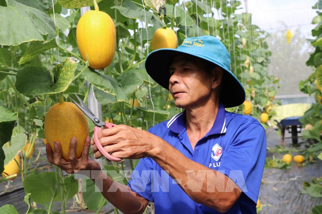 Ông Thạch Danh, xã Song Lộc thu hoạch dưa lưới dịp Tết. Ảnh: Thanh Hòa- TTXVN
