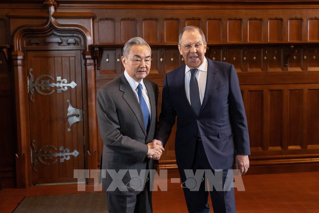 Ngoại trưởng Nga Sergey Lavrov (phải) hội đàm với Bộ trưởng Ngoại giao Trung Quốc Vương Nghị tại Moskva, ngày 1/4/2025. Ảnh: THX/TTXVN