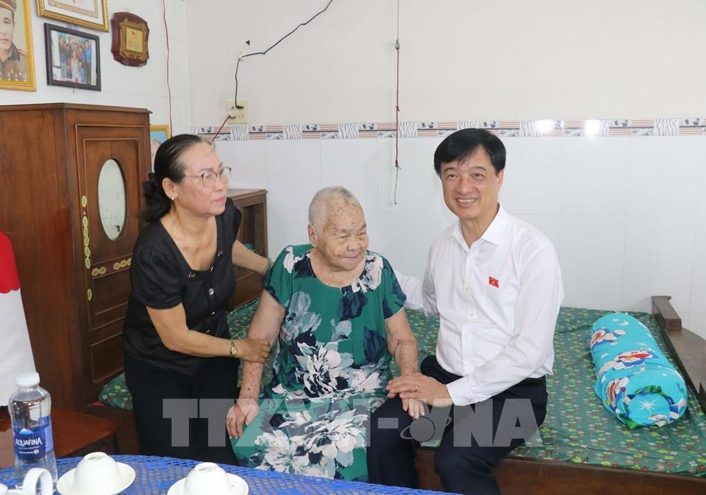 Đồng chí Nguyễn Duy Ngọc thăm, tặng quà gia đình Mẹ VNAH Huỳnh Thị Lành, 94 tuổi đời, 58 năm tuổi Đảng, có chồng là Anh hùng LLVTND Nguyễn Hữu Cầu, có 2 con là Liệt sĩ; ngụ tại phường An Bình. Ảnh: Ngọc Thiện - TTXVN