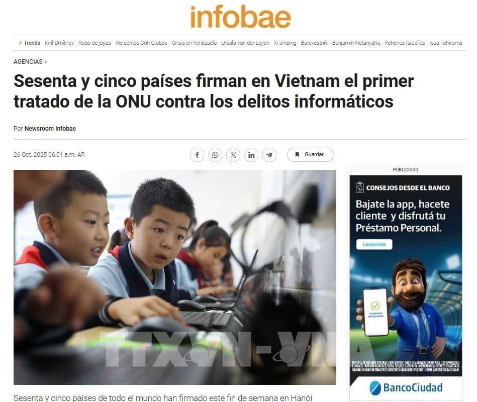 Ngày 26/10, tờ Infobae và tờ La Nacion của Argentina đưa tin hơn 70 quốc gia đã ký kết Công ước Liên hợp quốc (LHQ) về chống tội phạm mạng tại Hà Nội, còn được gọi là "Công ước Hà Nội", đánh dấu lần đầu tiên cộng đồng quốc tế có một khuôn khổ pháp lý ràng buộc để đối phó các hành vi phạm tội trên không gian mạng.