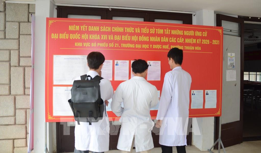 Sinh viên trường Đại học Y Dược, Đại học Huế, xem danh sách đại biểu ứng cử tại điểm bầu cử tại trường. Ảnh: Văn Dũng-TTXVN
