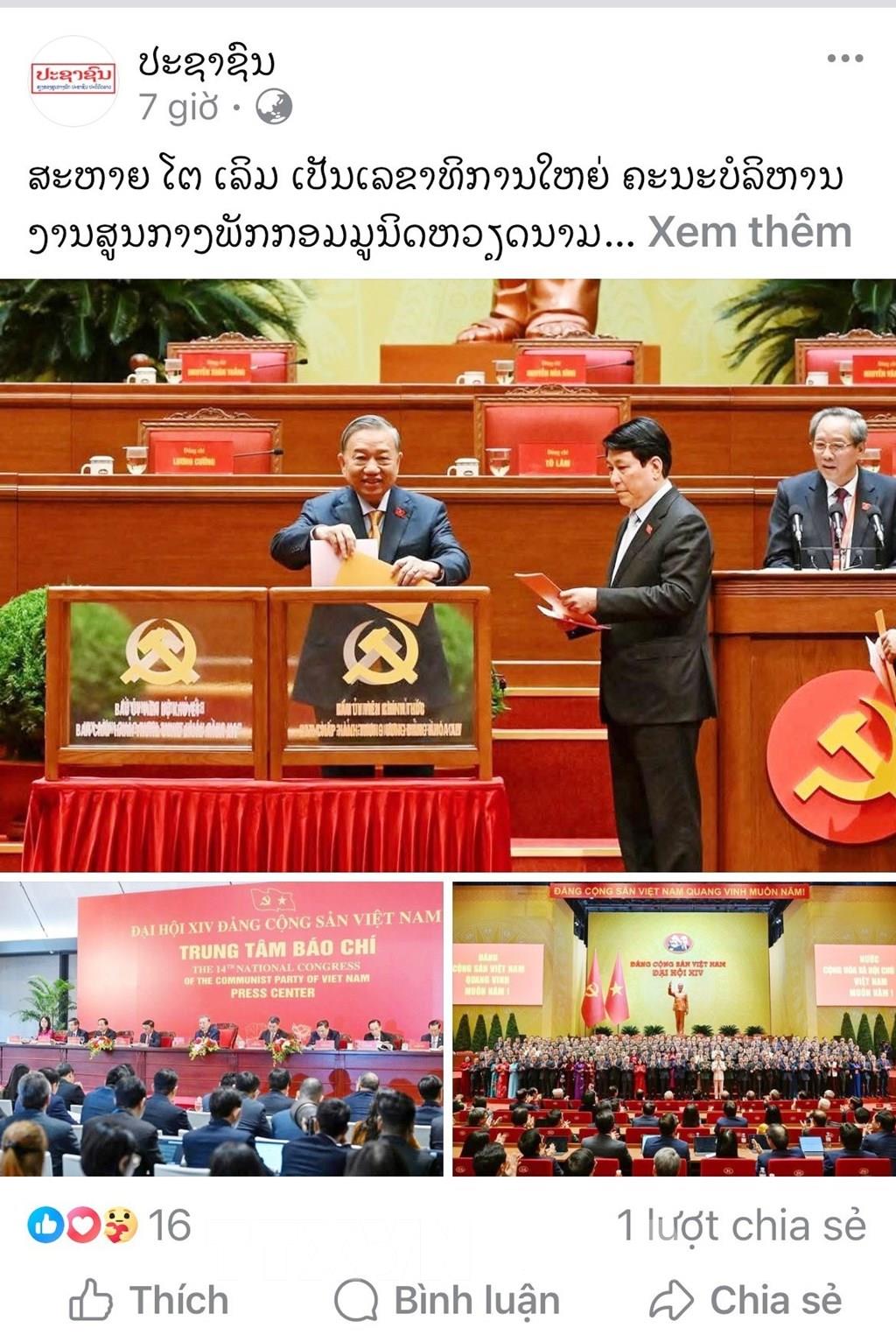 Theo phóng viên TTXVN tại Lào, bài viết trên tờ Pasaxon, cơ quan ngôn luận của Đảng Nhân dân cách mạng Lào, và bài viết trên tờ Pathetlao của Hãng Thông tấn quốc gia Lào đều khẳng định, Đại hội XIV của Đảng Cộng sản Việt Nam với chủ đề “Dưới lá cờ vẻ vang của Đảng, chung sức, đồng lòng thực hiện thắng lợi các mục tiêu phát triển đất nước đến năm 2030; tự chủ chiến lược, tự cường, tự tin, tiến mạnh trong kỷ nguyên vươn mình của dân tộc vì hoà bình, độc lập, dân chủ, giàu mạnh, phồn vinh, văn minh, hạnh phúc, vững bước đi lên chủ nghĩa xã hội" đã thành công tốt đẹp.