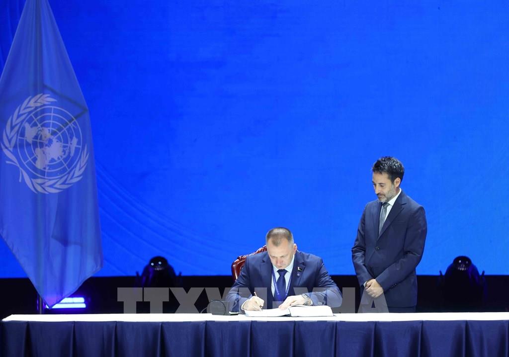 Bộ trưởng Nội vụ Cộng hoà Belarus Ivan Kubrakov ký Công ước của Liên hợp quốc về Chống tội phạm mạng. Ảnh: Phương Hoa - TTXVN