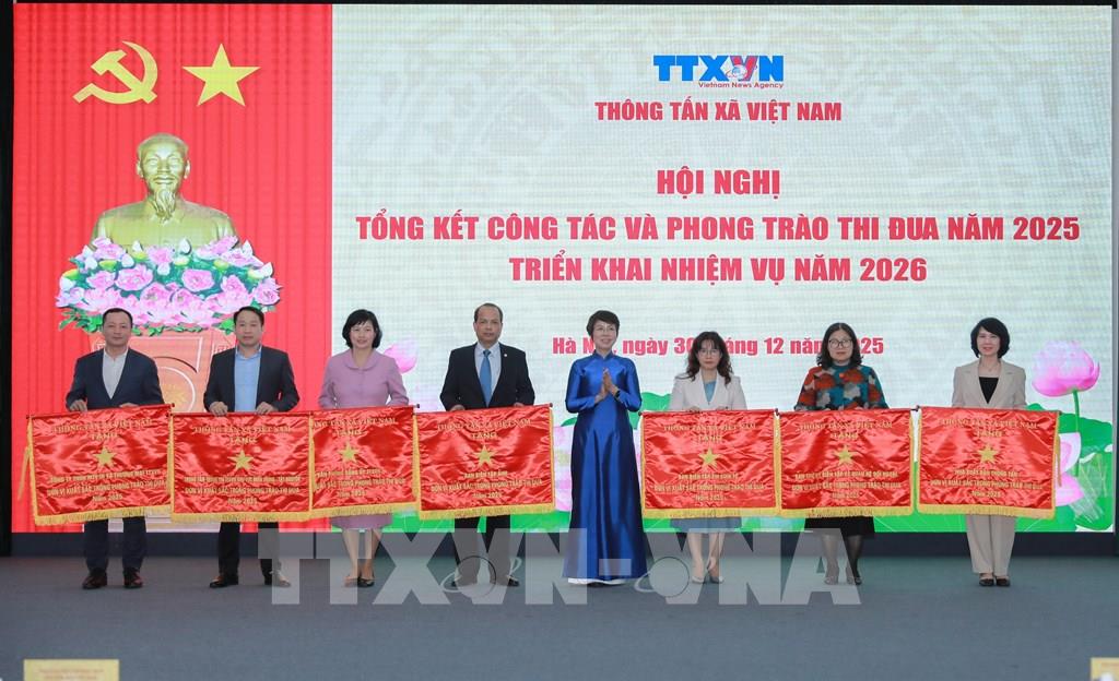 Bí thư Đảng uỷ, Tổng giám đốc TTXVN Vũ Việt Trang trao Cờ thi đua của ngành tặng các tập thể có thành tích xuất sắc trong phong trào thi đua năm 2025. Ảnh: Phan Phương – TTXVN