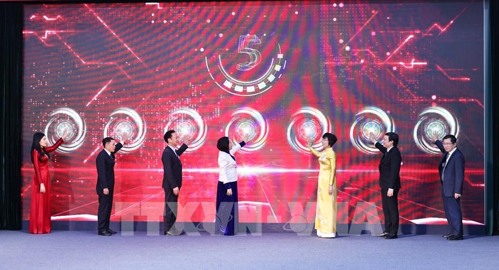 Phó Chủ tịch Quốc hội Nguyễn Thị Thanh và Tổng Giám đốc TTXVN Vũ Việt Trang cùng các đại biểu thực hiện nghi thức khai trương chuyên trang. Ảnh: Minh Đức – TTXVN