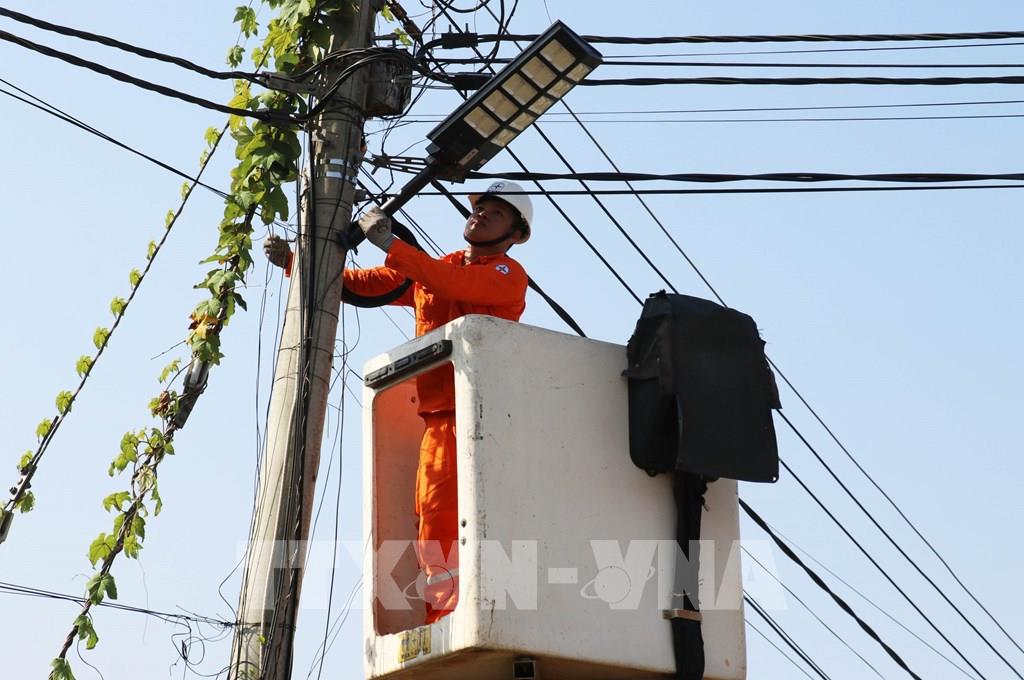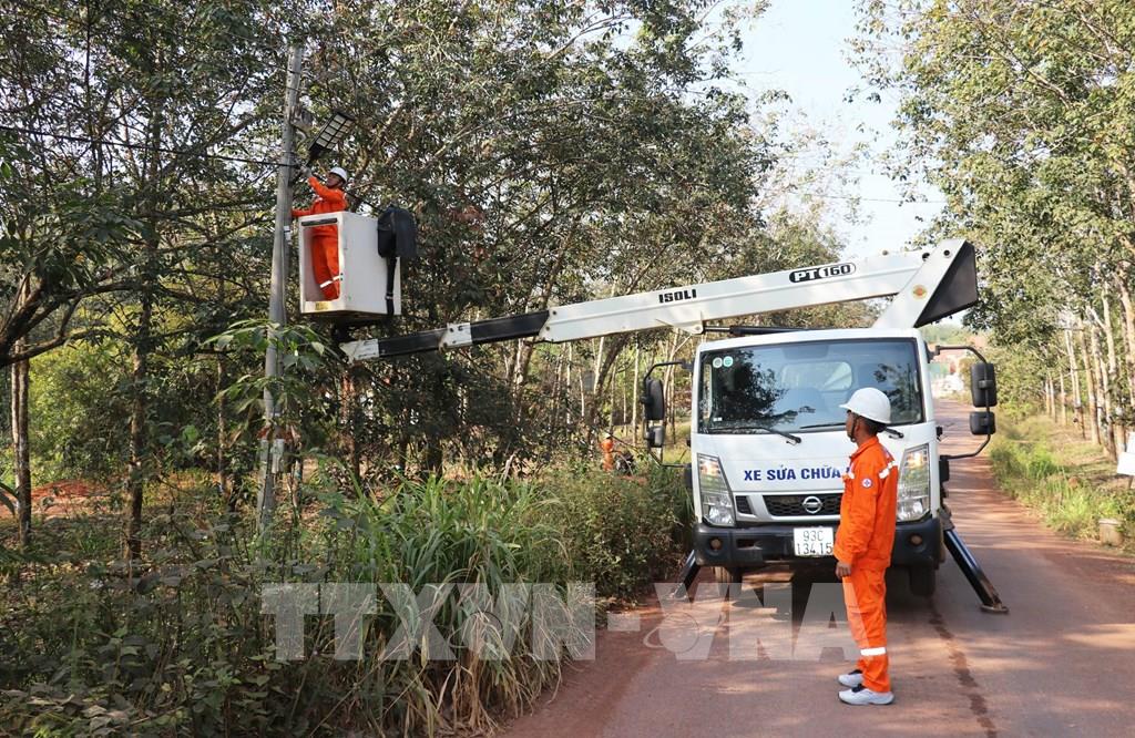 Công nhân Đội Điện lực Đồng Phú thi công lắp đặt đèn chiếu sáng năng lượng mặt trời tại thôn Tân Tiến, xã Đồng Phú, tỉnh Đồng Nai. Ảnh: Đậu Tất Thành – TTXVN