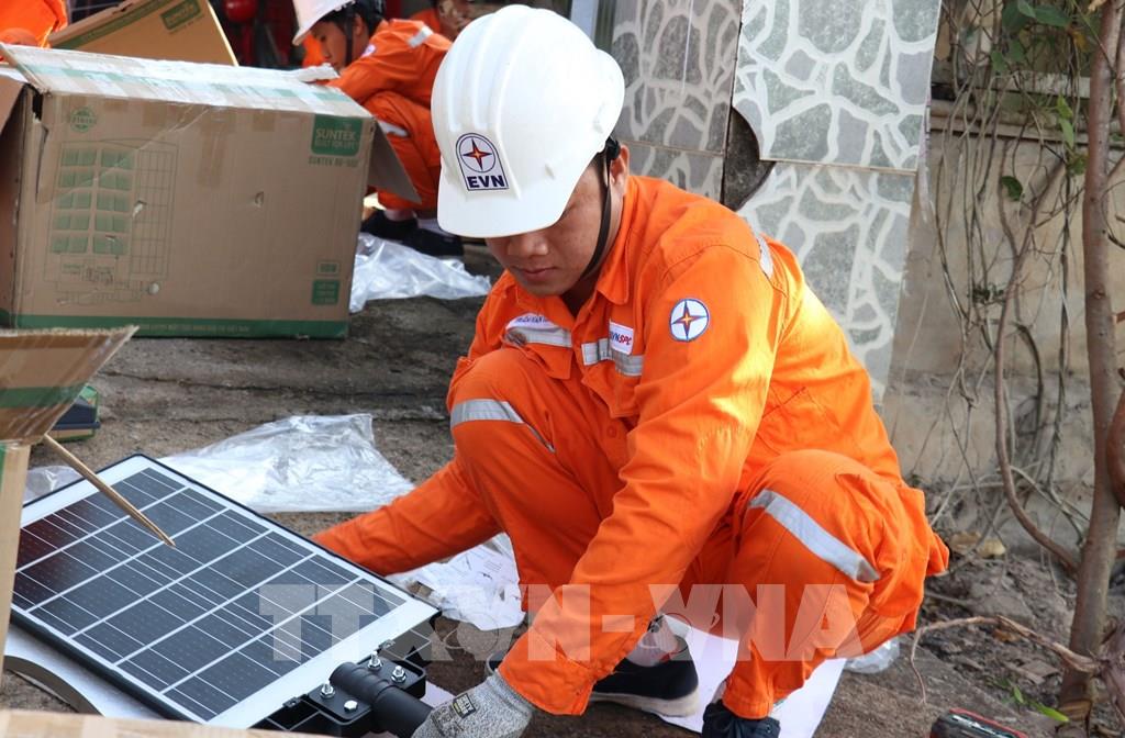 Công nhân Đội Điện lực Đồng Phú chuẩn bị, lắp ráp đèn năng lượng mặt trời phục vụ chương trình “Thắp sáng đường quê” tại thôn Tân Tiến, xã Đồng Phú, tỉnh Đồng Nai. Ảnh: Đậu Tất Thành - TTXVN