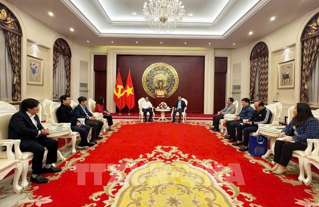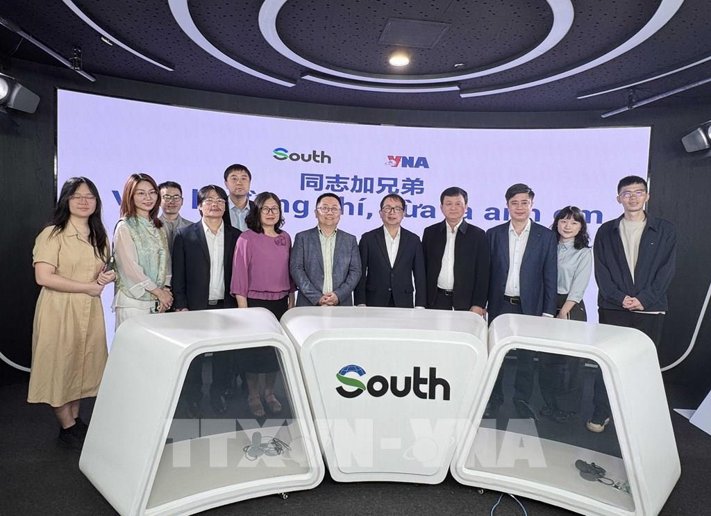Đoàn đại biểu TTXVN do Phó Tổng Giám đốc Nguyễn Tuấn Hùng dẫn đầu thăm và làm việc với Nhật báo Phương Nam có trụ sở tại Quảng Châu (Trung Quốc). Ảnh: THX/TTXVN phát