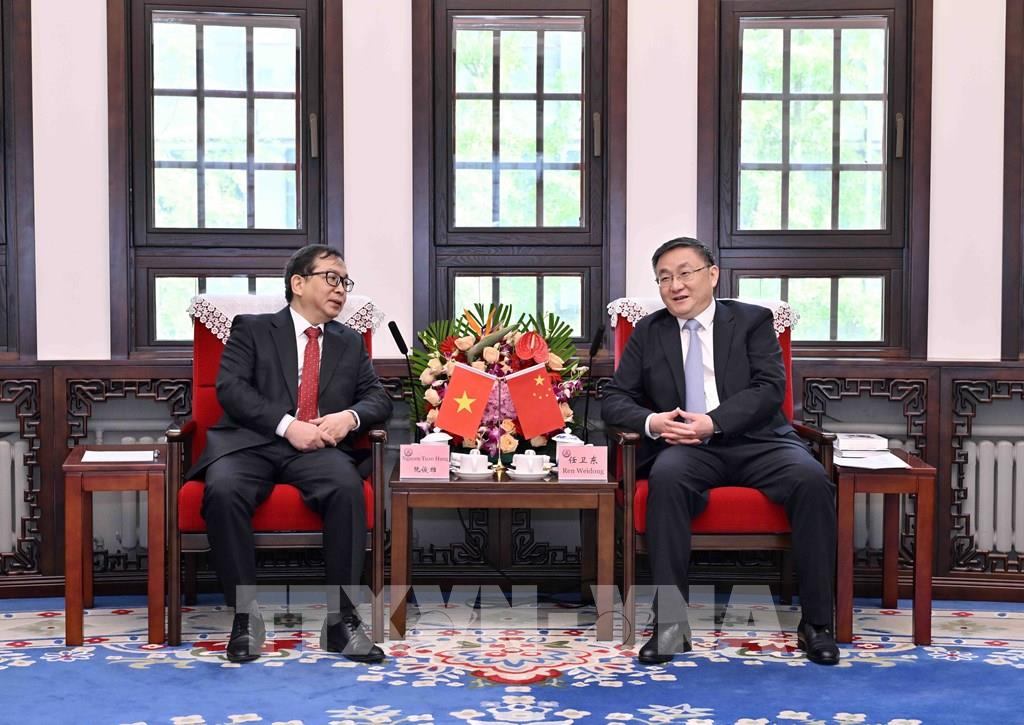 Phó Tổng Giám đốc TTXVN Nguyễn Tuấn Hùng (trái) hội đàm với đồng chí Nhậm Vệ Đông, Ủy viên Ban Cán sự Đảng, Phó Tổng Biên tập Tân Hoa xã. Ảnh: THX/TTXVN phát