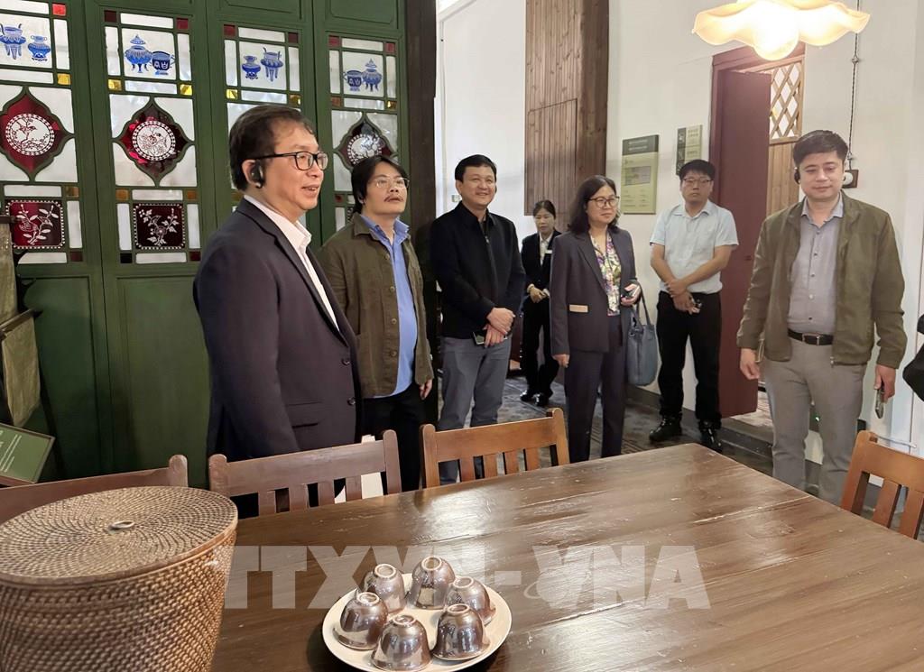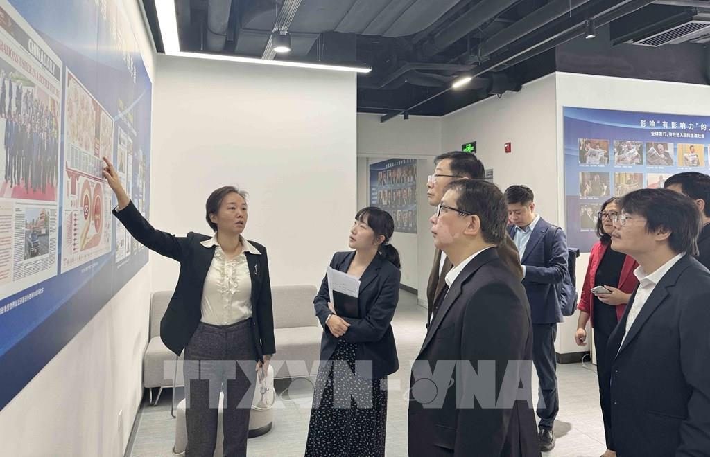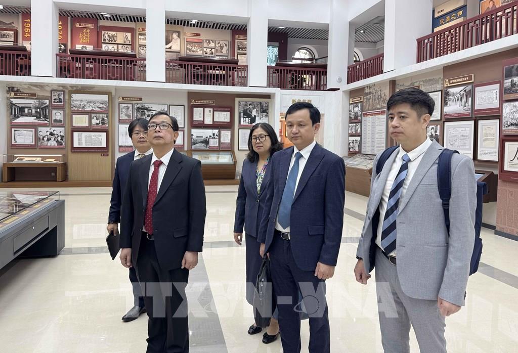 Đoàn đại biểu TTXVN do Phó Tổng Giám đốc Nguyễn Tuấn Hùng dẫn đầu thăm quan Nhà truyền thống của Tân Hoa xã. Ảnh: THX/TTXVN phát