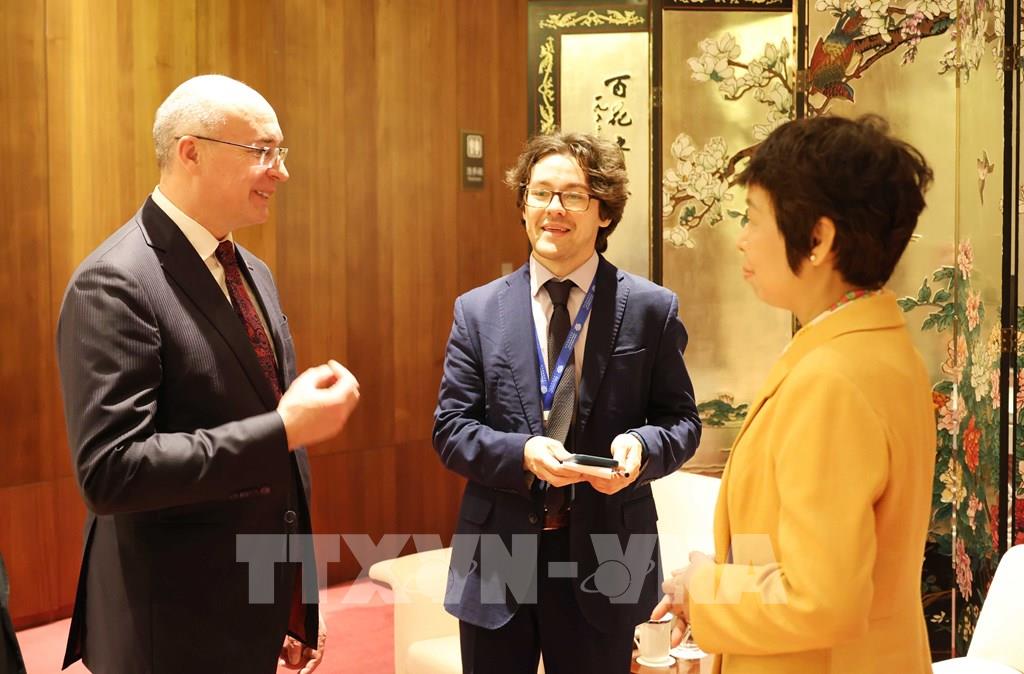 Tổng giám đốc TTXVN Vũ Việt Trang và Tổng giám đốc Hãng thông tấn TASS Andrey Kondrashov (trái) trao đổi về định hướng hợp tác giữa 2 hãng. Ảnh: Công Tuyên - PV TTXVN tại Trung Quốc