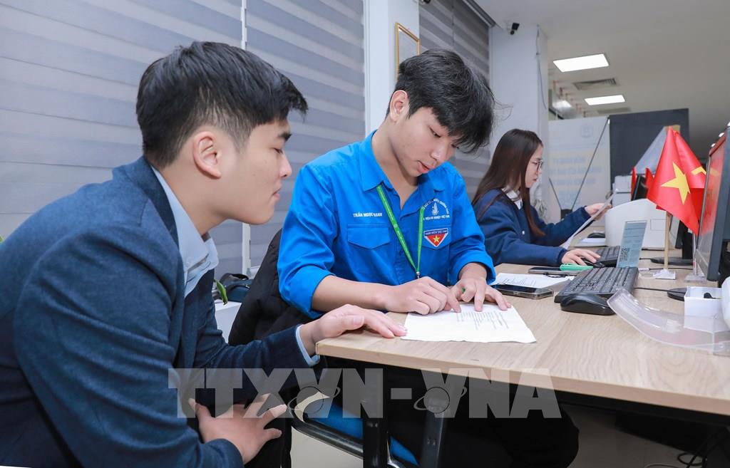 Đoàn viên thanh niên hướng dẫn người dân làm thủ tục hành chính thuế tại một diểm phục vụ hành chính công. Ảnh: Phan Phương – TTXVN