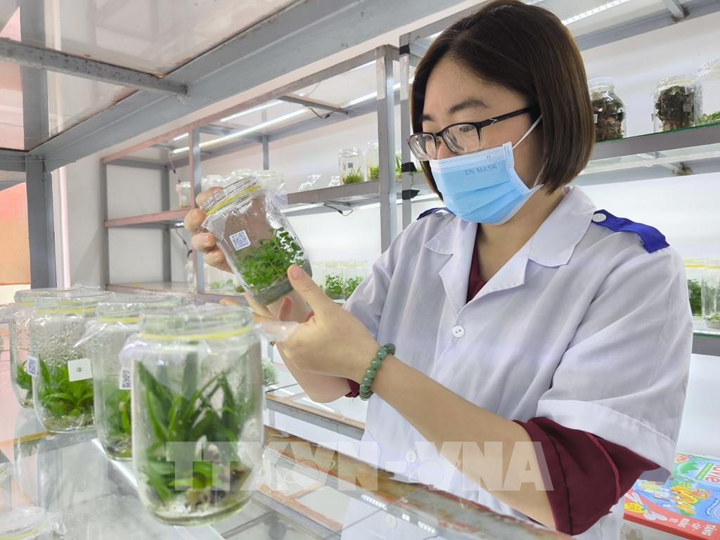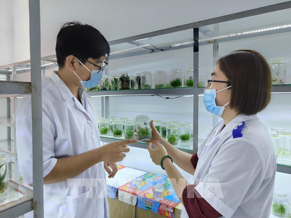 Nhân viên Trung tâm Sản xuất Giống và Hoa kiểng tỉnh Vĩnh Long thực kiểm tra cây giống nuôi cấy mô. Ảnh: Huỳnh Phúc Hậu - TTXVN