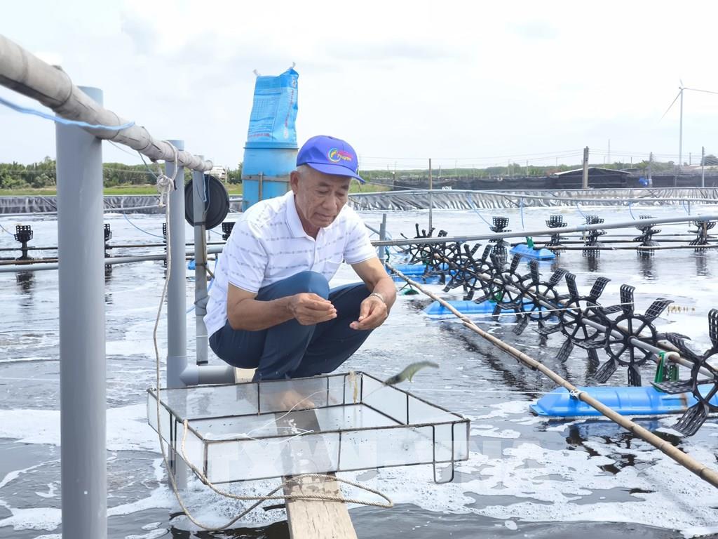 Ông Lê Văn Sấm (Ba Sấm), xã Thạnh Hải, tỉnh Vĩnh Long kiểm tra chất lượng tôm nuôi theo hướng ứng dụng công nghệ cao. Ảnh:Huỳnh Phúc Hậu - TTXVN