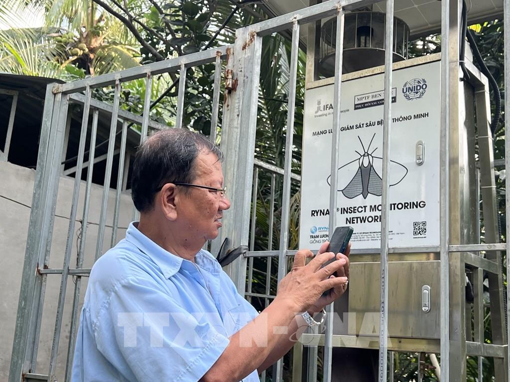 Ông Nguyễn Văn Bảy, Giám đốc Hợp tác xã (HTX) Bưởi da xanh Giồng Trôm, xã Châu Hòa, tỉnh Vĩnh Long kiểm tra mật độ sâu rầy tại hệ thống thông minh cảnh báo sâu rầy. Ảnh: Huỳnh Phúc Hậu - TTXVN