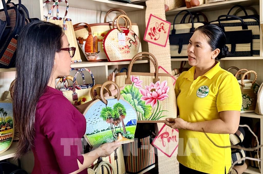 Các mẫu túi xách vẽ hoạ tiết hoa sen, cây Thốt Nốt khi tham quan cơ sở sản xuất của bà Thảo. Ảnh: Thanh Sang – TTXVN