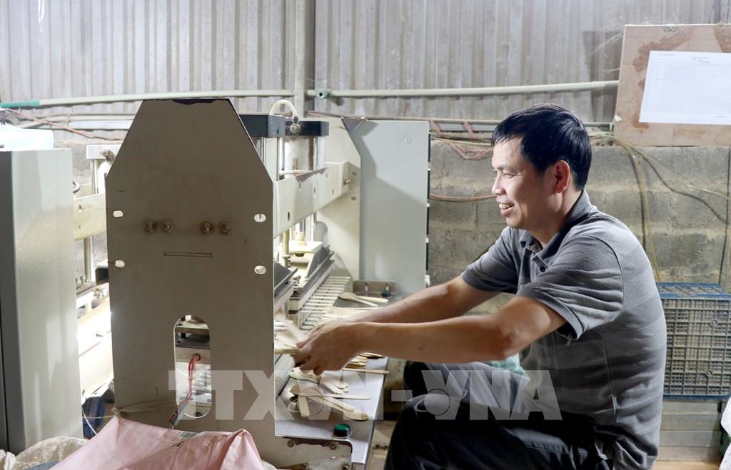 Anh Hoàng Văn Dũng, Giám đốc Công ty TNHH Sản xuất và Thương mại Hải Đăng, xã Trung Sơn (Tuyên Quang) trực tiếp tham gia sản xuất. Ảnh: Hoàng Hải - TTXVN