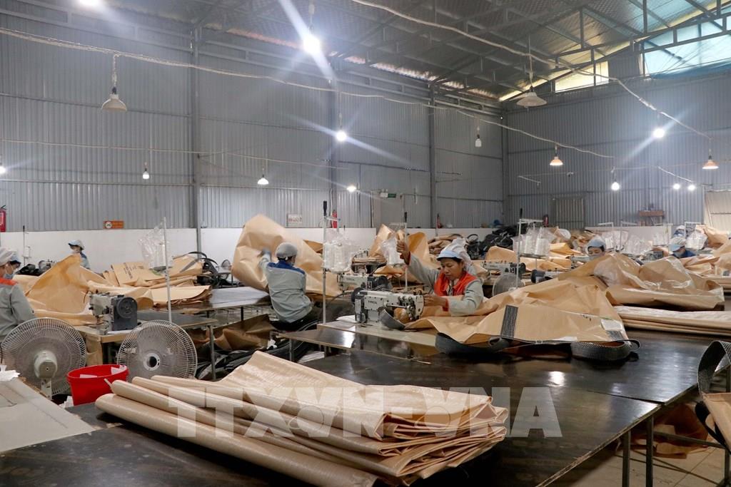 Công nhân làm việc tại Xưởng gia công bao bì PP xuất khẩu, Công ty TNHH Ngọc Năng Vina, xã Trường Sinh (Tuyên Quang). Ảnh: Hoàng Hải - TTXVN