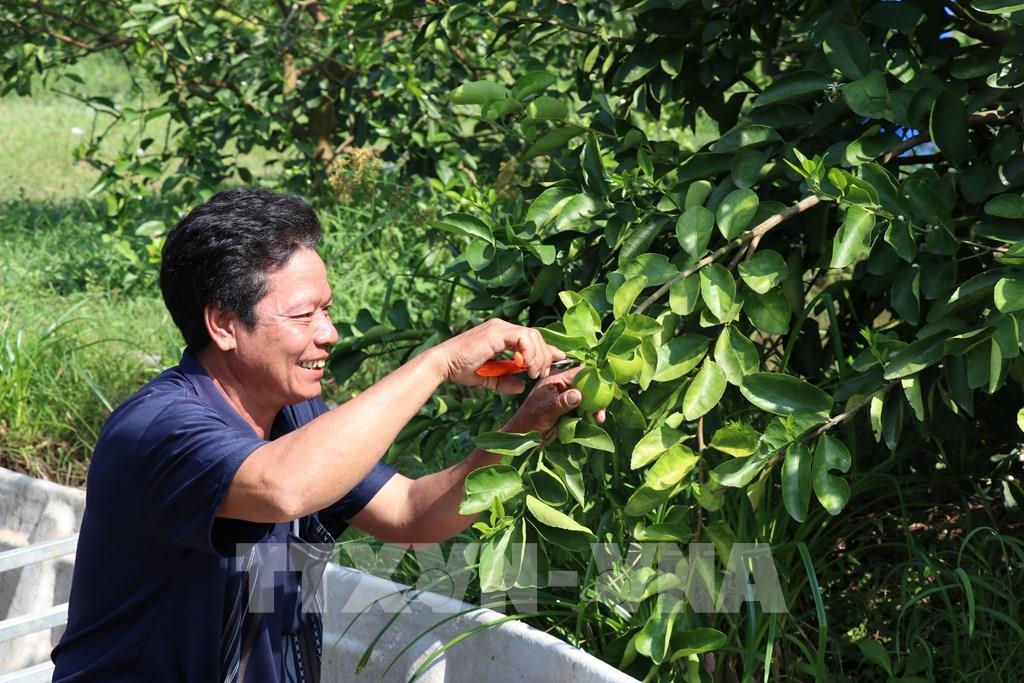 Vườn chanh không hạt 1,7 ha của gia đình ông Lâm Ngọc Hải (bên trái), thành viên Tổ chi hội nghề nghiệp trồng chanh không hạt xã Song Lộc cho hiệu quả cao gấp 6-8 lần so với trồng lúa. Ảnh: Thanh Hòa- TTXVN