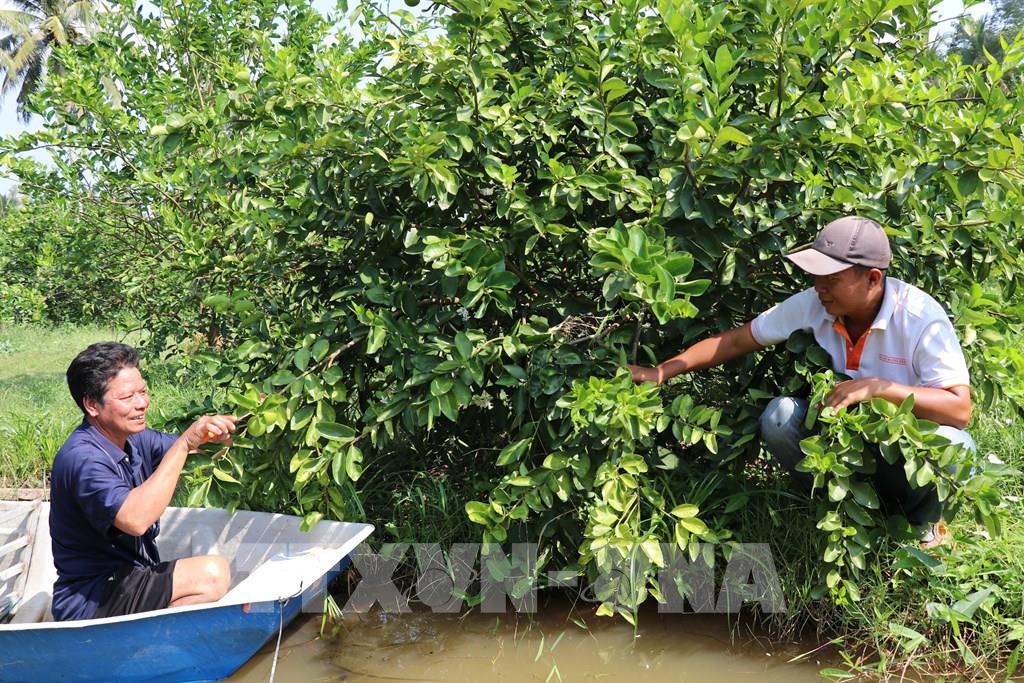 Vườn chanh không hạt 2 năm rưỡi của gia đình ông Lâm Ngọc Hải (bên phải), thành viên Tổ chi hội nghề nghiệp trồng chanh không hạt xã Song Lộc cho hiệu quả cao gấp 6-8 lần so với trồng lúa. Ảnh: Thanh Hòa- TTXVN
