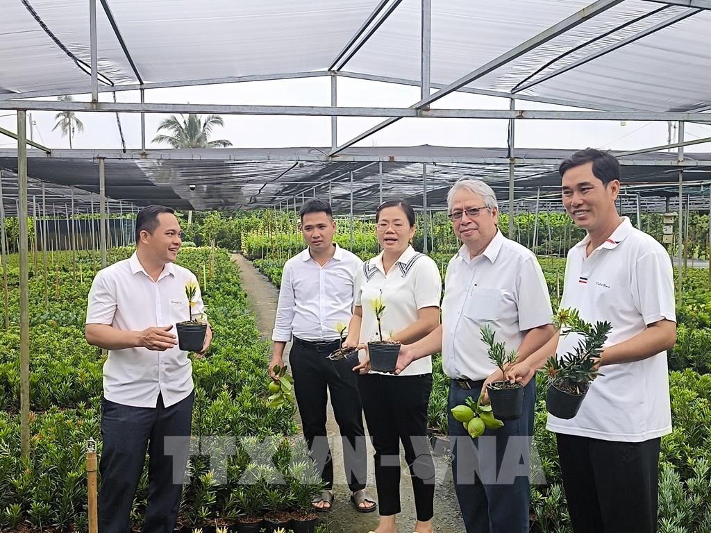 Thương lái, người dân tham quan vườn tùng của vợ chồng anh Nguyễn Văn Phúc, xã Vĩnh Thành, tỉnh Vĩnh Long. Ảnh: Huỳnh Phúc Hậu - TTXVN