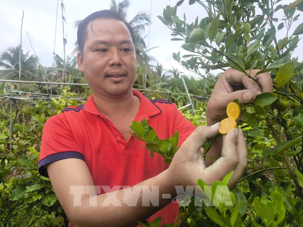 Anh Huỳnh Văn Tâm, xã Phú Phụng, tỉnh Vĩnh Long kiểm tra cây tắc (quất) không hạt giống đầu dòng. Ảnh: Huỳnh Phúc Hậu - TTXVN