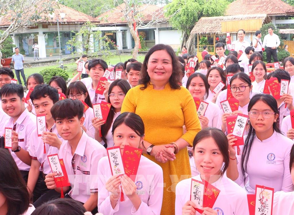 Phó Bí thư thường trực Tỉnh ủy Vĩnh Long Hồ Thị Hoàng Yến tặng học sinh những câu chúc đầu năm. Ảnh: Lê Thúy Hằng – TTXVN
