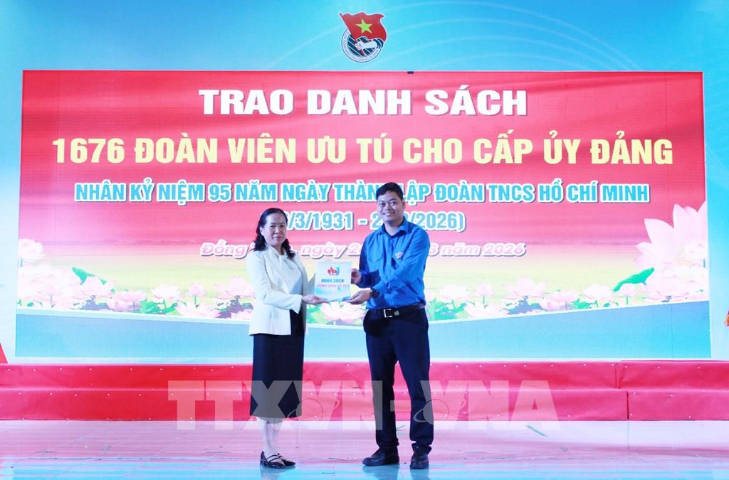 Ông Lê Hoàng Quyết, Bí thư Tỉnh đoàn Đồng Tháp, trao danh sách 1676 đoàn viên ưu tú cho cấp uỷ Đảng Đồng Tháp. Ảnh: Hồng Nhung - TTXVN