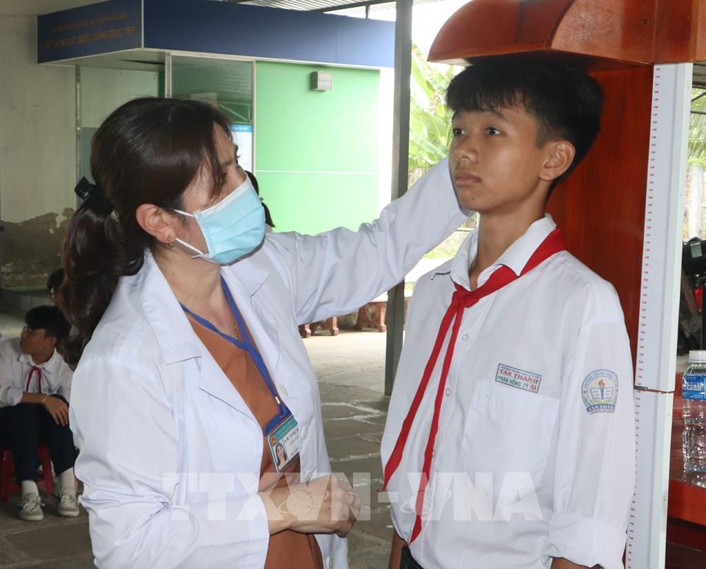 Khám sức khỏe cho các em học sinh trường THCS Tân Thành (phường Tân Thành) sau lễ phát động. Ảnh: Tuấn Phi - TTXVN