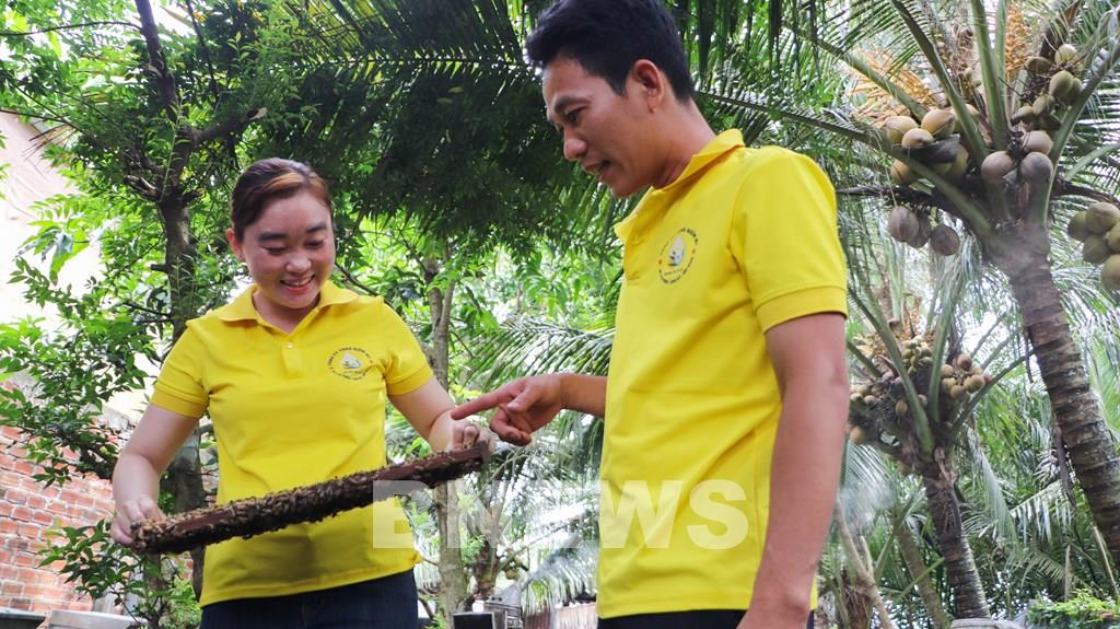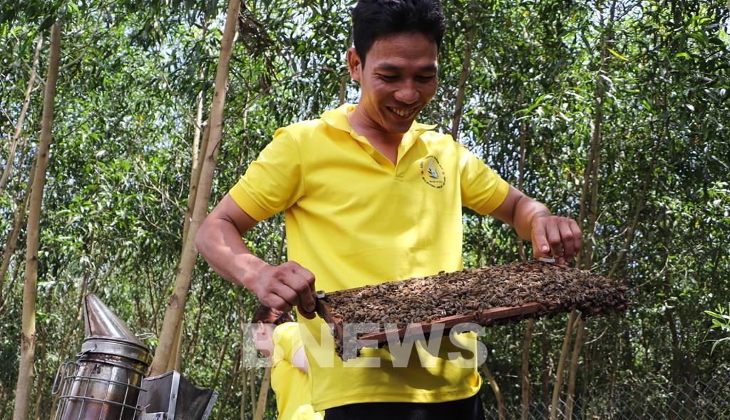 Anh Trần Minh Nìm (xã Xà Phiên, thành phố Cần Thơ) kiểm tra ong mật. ẢNh: Hồng Thái-TTXVN