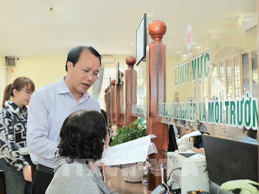 Ông Ngô Hồng Khang, Chủ tịch UBND phường Bình Phước hỏi thăm người dân đến làm thủ tục hành chính tại Trung tâm Phục vụ hành chính công phường Bình Phước. Ảnh: K GỬIH-TTXVN