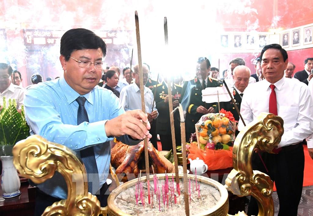 Bí thư Tỉnh ủy An Giang Nguyễn Tiến Hải, Bí thư Đảng ủy Quân sự tỉnh An Giang dâng hương tại Đền tưởng niệm Anh hùng, liệt sĩ và người có công. Ảnh: Văn Sĩ - TTXVN