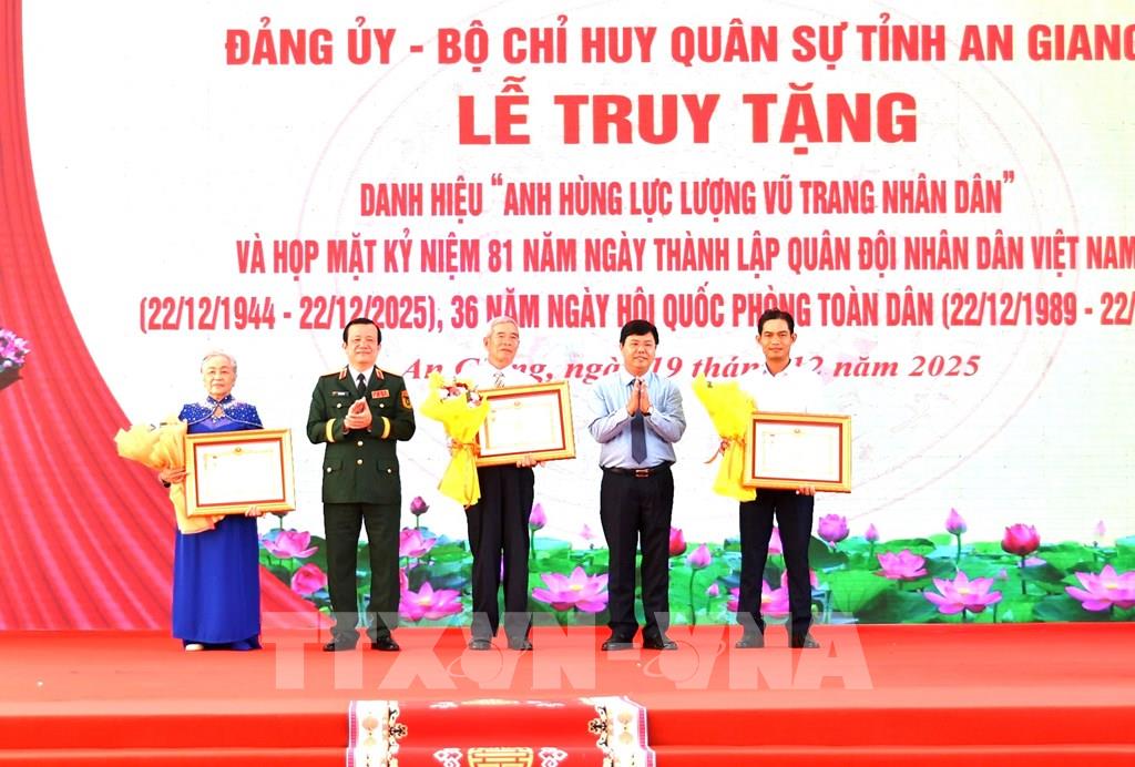 An Giang có địa bàn chiến lược, quan trọng về quốc phòng, an ninh trong thế trận phòng thủ chung của Quân khu và cả nước. Sau hợp nhất tỉnh, lực lượng vũ trang có chất lượng tổng hợp, sức chiến đấu cao, đủ sức hoàn thành mọi nhiệm vụ bảo vệ vững chắc chủ quyền biên giới quốc gia vùng Tây Nam của Tổ quốc. Lực lượng vũ trang tỉnh nêu cao tinh thần trách nhiệm, phát huy truyền thống vẻ vang của các thế hệ đi trước; giữ vững bản lĩnh chính trị, thường xuyên nâng cao chất lượng công tác huấn luyện, sẵn sàng chiến đấu; chủ động nắm chắc tình hình, tham mưu đúng, trúng, kịp thời cho Đảng ủy, Bộ Tư lệnh Quân khu 9, Tỉnh ủy, Ủy ban nhân dân tỉnh. Các lực lượng phối hợp chặt chẽ bảo vệ vững chắc chủ quyền biên giới quốc gia, xây dựng khu vực phòng thủ vững mạnh, đẩy mạnh phong trào thi đua Quyết thắng; tích cực tham gia phát triển kinh tế, xã hội, phòng, chống thiên tai, dịch bệnh, cứu hộ, cứu nạn, củng cố “thế trận lòng dân”, góp phần giữ vững môi trường hòa bình, ổn định, tạo điều kiện để tỉnh phát triển trở thành trung tâm kinh tế, văn hóa, xã hội của khu vực Đồng bằng sông Cửu Long và cả nước.Tại buổi lễ, Ban tổ chức đã công bố quyết định truy tặng danh hiệu Anh hùng Lực lượng vũ trang nhân dân cho Thượng tá Nguyễn Thành Kính (Ba Kính), nguyên Tỉnh đội trưởng Tỉnh đội Rạch Giá; Thiếu tá Võ Đông Trạch (Tư Trạch), nguyên Tỉnh đội trưởng Tỉnh đội Rạch Giá và Liệt sĩ Trần Văn Tủy (Hai Tăng), nguyên Huyện đội trưởng Huyện đội Giồng Riềng, Tỉnh đội Rạch Giá (nay là tỉnh An Giang). Danh hiệu Anh hùng Lực lượng vũ trang nhân dân được truy tặng cho 3 đồng chí là sự khẳng định, tôn vinh những tấm gương kiên trung, bất khuất, góp phần tô thắm thêm truyền thống vẻ vang của Lực lượng vũ trang trong tỉnh, nhắc nhở chúng ta tiếp tục phấn đấu, rèn luyện, hoàn thành xuất sắc nhiệm vụ mà Đảng, Nhà nước và nhân dân giao phó trong kỷ nguyên mới.