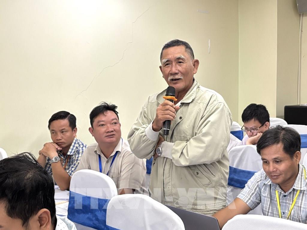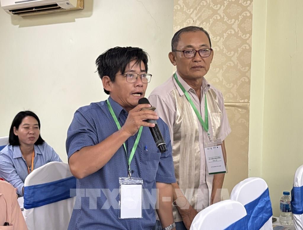 Ông Nguyễn Phát Tài, HTX lúa sếu Tam nông, đề xuất giải pháp liên kết tiêu thụ trong sản xuất lúa. Ảnh: Hồng Nhung - TTXVN