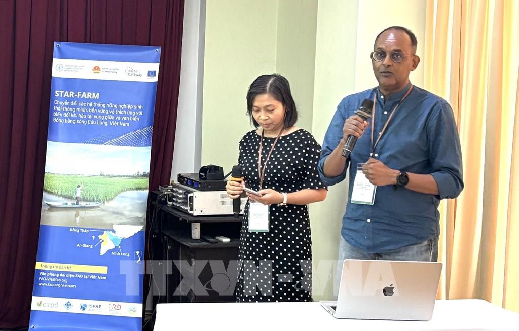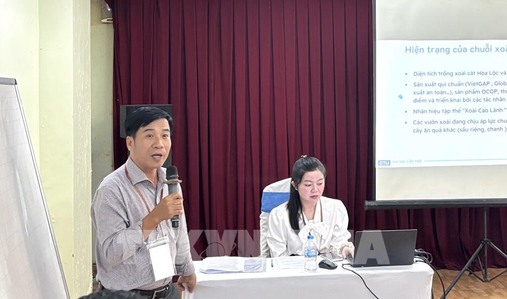 Tiến sĩ Võ Văn Tấn, Đại học Cần Thơ, chia sẻ giải pháp phát triển nông nghiệp sinh thái đối với 2 loại nông sản xoài và sen của Đồng Tháp. Ảnh: Hồng Nhung - TTXVN