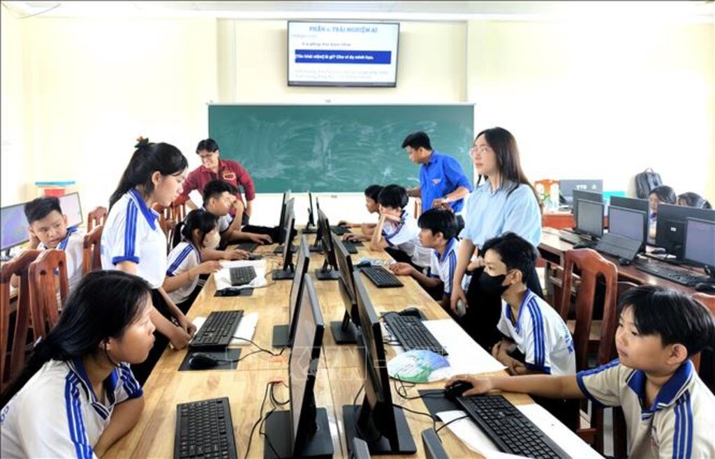 Đoàn viên Trường Đại học Sư phạm Kỹ thuật Vĩnh Long phổ cập kỹ năng số cho học sinh. Ảnh: Lê Thúy Hằng - TTXVN