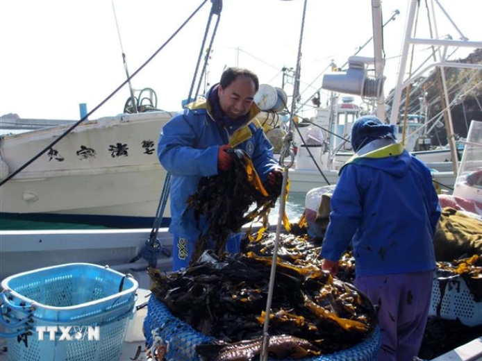 Ngư dân Nhật Bản sơ chế tảo biển mới thu hoạch. (Ảnh: Đào Thanh Tùng/TTXVN)
