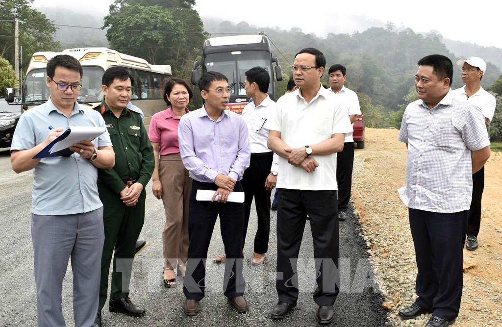 Phó Chủ tịch Thường trực UBND tỉnh Tuyên Quang Nguyễn Mạnh Tuấn (thứ 2, phải sang) kiểm tra tiến độ thi công tuyến đường cách mạng Tân Trào – Trung Yên. Ảnh: TTXVN phát