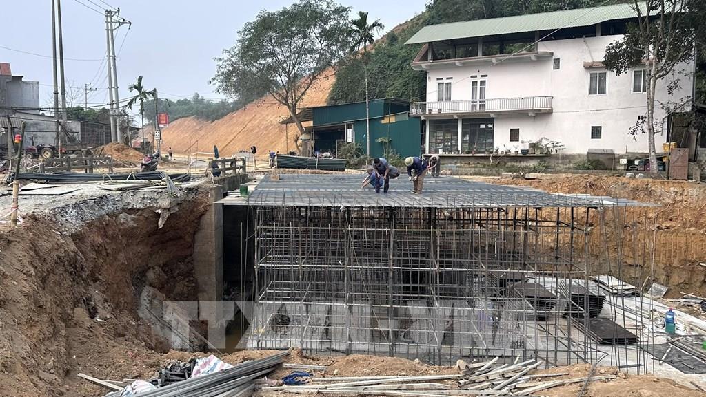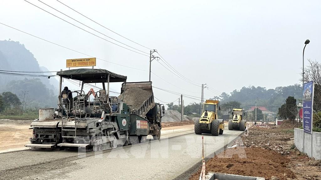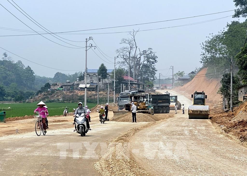 Đơn vị thi công đẩy nhanh tiến độ thi công tuyến đường cách mạng Tân Trào – Trung Yên, bảo đảm tiến độ thông xe trước ngày 19/5/2026. Ảnh: TTXVN phát