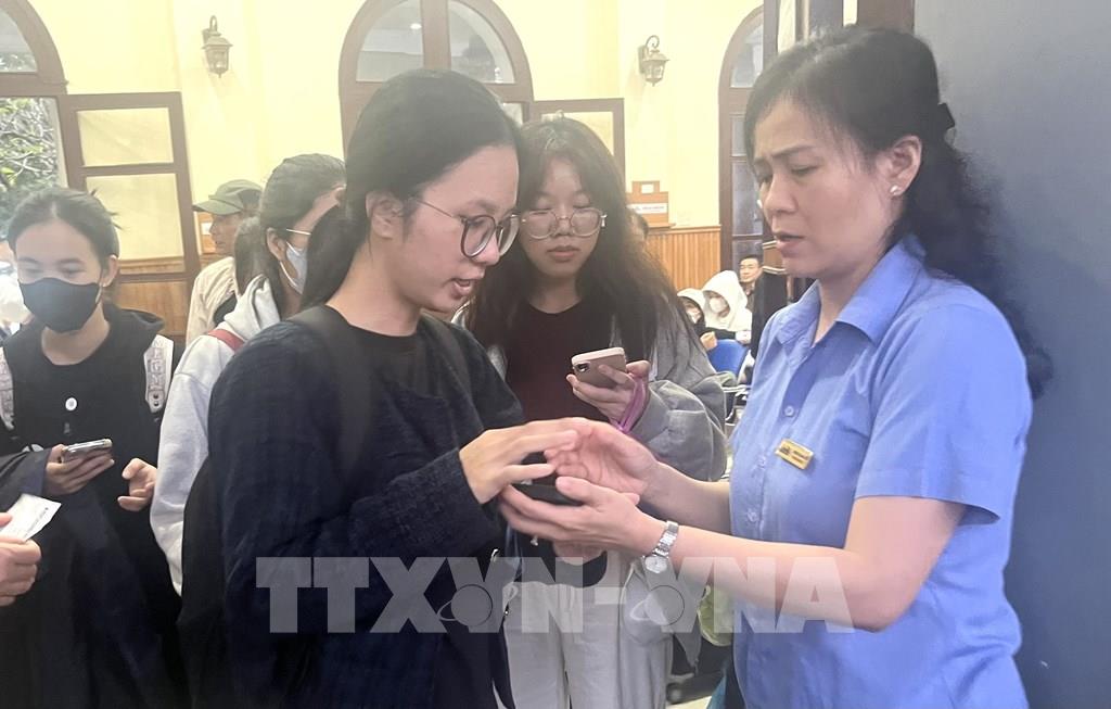 Nhân viên đường sắt kiểm soát vé hành khách lên tàu SE4 tại ga Huế. Ảnh: Văn Dũng-TTXVN